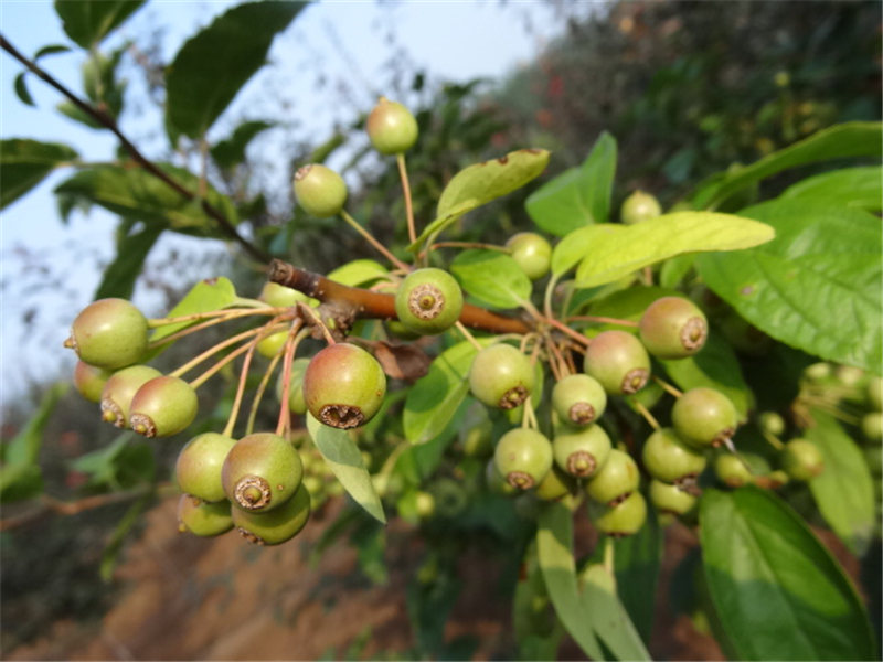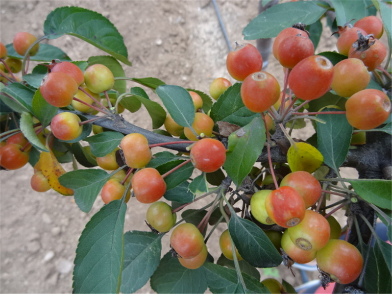 從遠處看,一片片滿樹的海棠果掛滿枝條,像它在冬天不懼嚴寒而盛開的紅花。